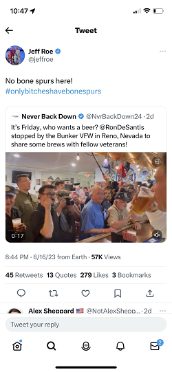 Jeff Roe, head of the SuperPac Tweeted this. In case you can’t read what he wrote in his subtweet of the Never Back Down twitter account, it says “No Bone Spurs Here” and then hashtag is