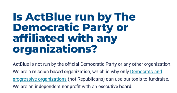 From the ActBlue website:We are a mission-based organization, which is why only Democrats and progressive organizations (not Republicans) can use our tools to fundraise.