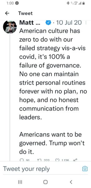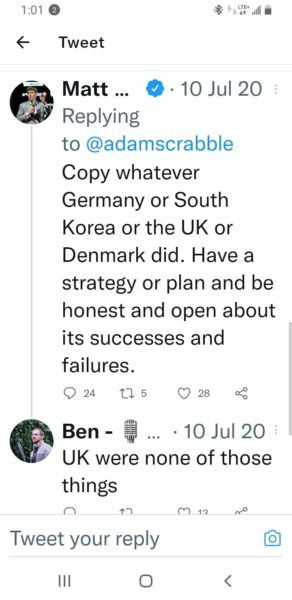 And Matt’s reply: “copy whatever Germany or South Korea or the UK or Denmark did. Have strategy on plan and be honest and open about its successes and failures”